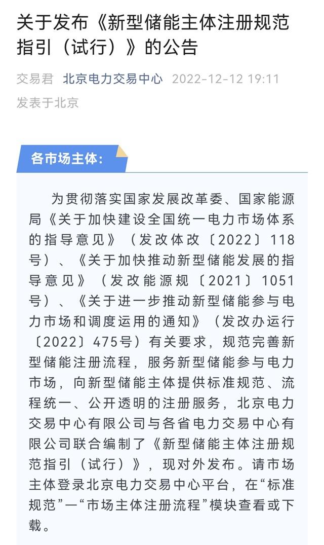 12日晚,北京市電力交易中心發(fā)布《新型儲能主體注冊規(guī)范指引(試行)》公告(下稱《指引》)。這是交易機(jī)構(gòu)首次從實(shí)施層面統(tǒng)一明確將新型儲能作為獨(dú)立于發(fā)電企業(yè)、售電公司和用戶的注冊類型,并且規(guī)范了詳細(xì)的注冊程序與所需信息、資料。