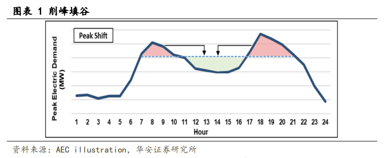 新能源發(fā)電波動性明顯,存在峰值時發(fā)電功率高于電網(wǎng)負荷,產(chǎn)生棄風棄光的問題。未來隨新能源裝機比例提升,棄風棄光的問題將日益突出。加強電網(wǎng)基建可以提升其負荷,使其可以承載更高功率的發(fā)電。配備發(fā)電側(cè)儲能則可以在電網(wǎng)輸送通道受限和光伏/風電滿負荷工作的情況下實現(xiàn)調(diào)峰,平滑新能源發(fā)電輸出曲線,緩解電網(wǎng)負擔。削峰填谷可以在低需求時段吸收電力,并在高峰需求時段將其釋放到電網(wǎng)或支持客戶的負載。這有效地將一些負荷從高峰時段(紅色)轉(zhuǎn)移到非高峰時段(綠色)。