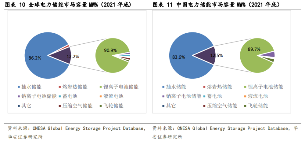 化學儲能和電化學儲能統(tǒng)稱為新型儲能,是目前主要主要的發(fā)展方向。電化學儲能同時具有較高的能量密度和功率密度,決定了其廣泛的技術(shù)適用性。其中,鋰離子電池同時具有高功率密度與高能量密度。根據(jù)CNESA全球儲能項目數(shù)據(jù)庫的統(tǒng)計,截至2021年底,中國各類型儲能裝機量結(jié)構(gòu)與全球情況相似,均以抽水蓄能為主要裝機類型,占據(jù)86%左右裝機容量。全球運行的電力儲能項目容量總計為209.4GW,同比增長 9%。抽水蓄能比重首次低于90%,同比下降4.1個百分點。其次是新儲能,為25.4GW,同比增長67.7%。鋰離子電池在新能源存儲中占比最大,市場份額超過90%。