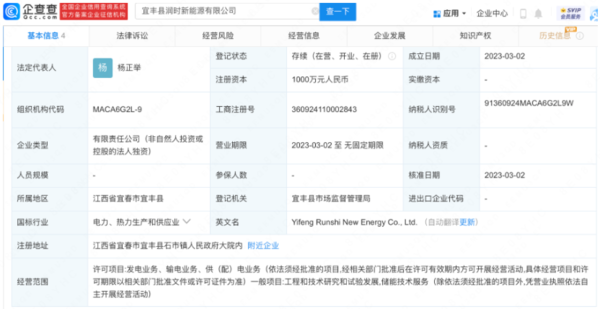 企查查APP顯示,2023年3月2日,宜豐縣潤時(shí)新能源有限公司成立。該公司的法定代表人為楊正舉,注冊(cè)資本1000萬元人民幣。