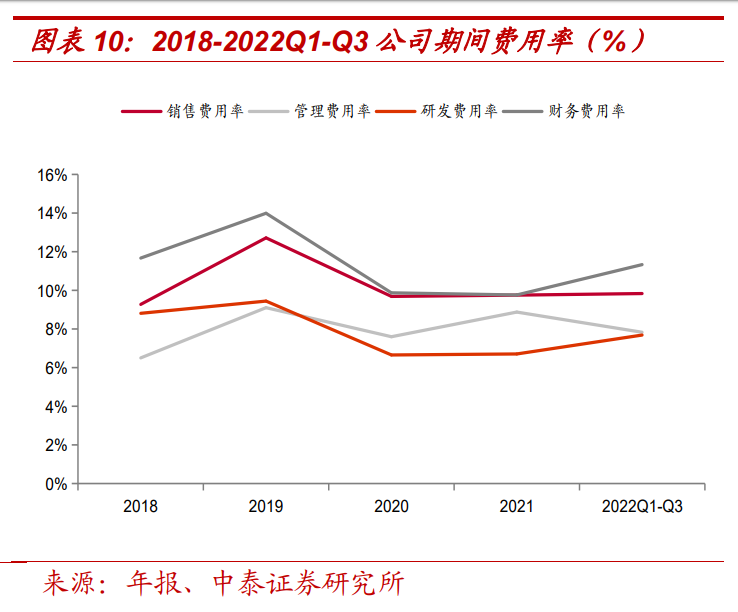 期間費(fèi)用呈下降趨勢(shì),但仍有較大進(jìn)步空間。2019-2021 年公司期間費(fèi) 用率分別為 36.3%/45.3%/33.8%/35.1%/36.7%,雖然呈現(xiàn)總體下降趨勢(shì), 但仍高于同行平均值,費(fèi)用管控能力有望進(jìn)一步提升。其中 2022 年前 三季度銷售/管理/研發(fā)/財(cái)務(wù)費(fèi)用率分別為 9.8%/7.8%/7.7%/11.3%,打破 前兩年的下降趨勢(shì),主要是因?yàn)楣臼杖塍w量較低,規(guī)模效應(yīng)尚未體現(xiàn), 且公司近年來(lái)營(yíng)運(yùn)資金緊缺,導(dǎo)致公司主動(dòng)放棄大量周期長(zhǎng)、墊資金額高的訂單,也限制了營(yíng)收規(guī)模的增長(zhǎng),導(dǎo)致各方面人效降低。但隨著公 司業(yè)務(wù)擴(kuò)張的不斷推進(jìn)和資金鏈的緩解,期間費(fèi)用率有望好轉(zhuǎn)。