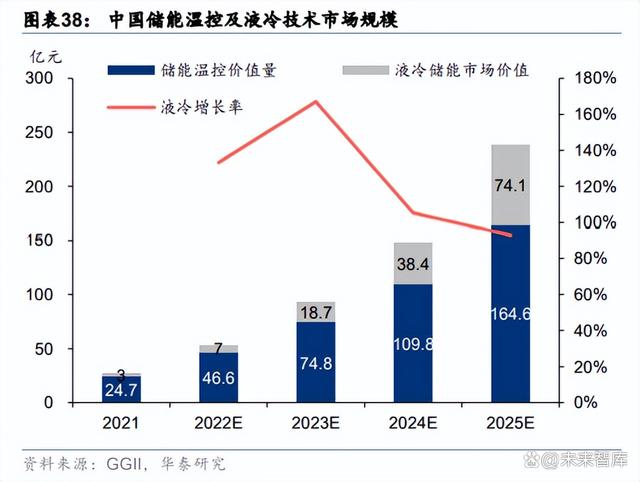 液冷針對大儲優(yōu)勢凸顯,未來市場規(guī)模將快速提升。液冷在技術(shù)上具備優(yōu)勢,當(dāng)前大容量、 高功率儲能系統(tǒng)的快速應(yīng)用,對于儲能系統(tǒng)散熱效率要求更高。液冷技術(shù)相比于傳統(tǒng)風(fēng)冷 散熱效率更高,同時噪音更小、能耗更低,具有顯著優(yōu)勢,單位價(jià)值量相比風(fēng)冷也會有明 顯提升。隨著儲能電站大型化、集約化的不斷發(fā)展,儲能系統(tǒng)大容量、高密度的趨勢不斷 凸顯,未來液冷市場規(guī)模預(yù)計(jì)會快速增長。根據(jù) GGII,2021 年中國儲能溫控市場整體規(guī)模 為 24.7 億元,液冷溫控市場規(guī)模 3 億元。GGII 預(yù)計(jì)到 2025 年,中國儲能溫控市場總規(guī)模 將達(dá)到 164.6 億元,液冷儲能市場價(jià)值將達(dá)到 74.1 億元,占比約 45.1%,年復(fù)合增長率超 過 89%。
