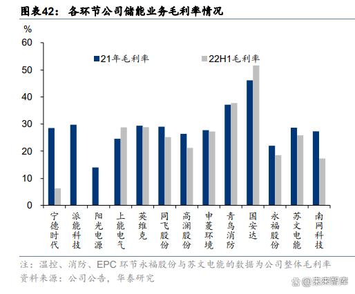 各環(huán)節(jié) 22H1 毛利率相比 21 年全年普遍走低,消防環(huán)節(jié)毛利率水平最高。21 年電芯環(huán)節(jié) 兩家企業(yè)儲能業(yè)務(wù)毛利率處于 28%-30%,22H1 受到上游鋰礦價(jià)格高漲且傳導(dǎo)滯后影響, 盈利空間被顯著壓縮,以寧德時代為例,22H1 毛利率下滑至 6.43%。消防環(huán)節(jié)毛利率最高, 且兩家公司 22H1 毛利率相比 21 年均有提升,我們認(rèn)為主要系公司產(chǎn)品結(jié)構(gòu)優(yōu)化致整體毛 利率水平抬升。儲能 PCS 及系統(tǒng)集成環(huán)節(jié)內(nèi)各公司由于業(yè)務(wù)結(jié)構(gòu)及出貨市場的不同毛利率 水平差異較大,陽光電源/上能電氣 2021 年儲能業(yè)務(wù)毛利率水平分別為 14.11% /24.52%。 溫控環(huán)節(jié)毛利率普遍在 25%-30%之間。EPC 環(huán)節(jié) 21 年毛利率普遍在 20%-30%之間,22H1 毛利率水平出現(xiàn)明顯下滑。
