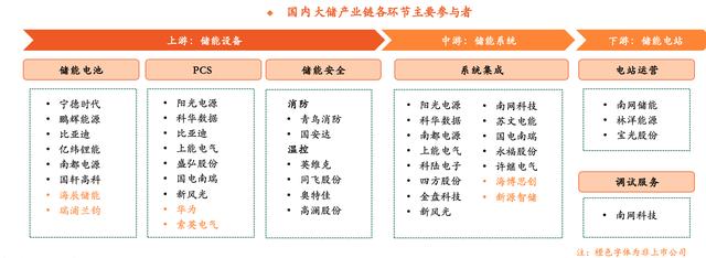 大儲產(chǎn)業(yè)鏈主要包括上游儲能設(shè)備、中游系統(tǒng)集成、下游電站等環(huán)節(jié)。儲能電池和PCS是大儲產(chǎn)業(yè)鏈價值量最大的兩個環(huán)節(jié),陳驍?shù)热苏J為,儲能電池絕對龍頭寧德時代,第二梯隊比亞迪、鵬輝能源、億緯鋰能、國軒高科、南都電源、海辰儲能等有望借國內(nèi)大儲市場加速贏得動力電池之外的第二成長曲線。國內(nèi)大儲PCS頭部企業(yè)陽光電源、科華數(shù)據(jù)、上能電氣、盛弘股份、國電南瑞、新風光等在裝機提速+毛利改善下業(yè)績有望受益。