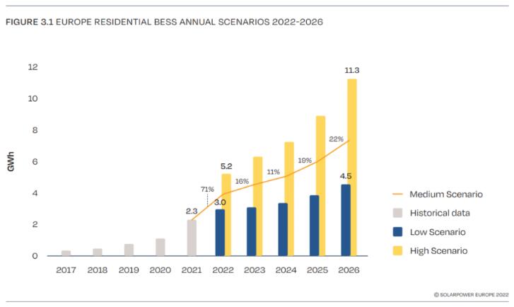 歐洲光伏產業(yè)協(xié)會《歐洲戶用儲能市場展望報告 2022-2026》裝機量預測