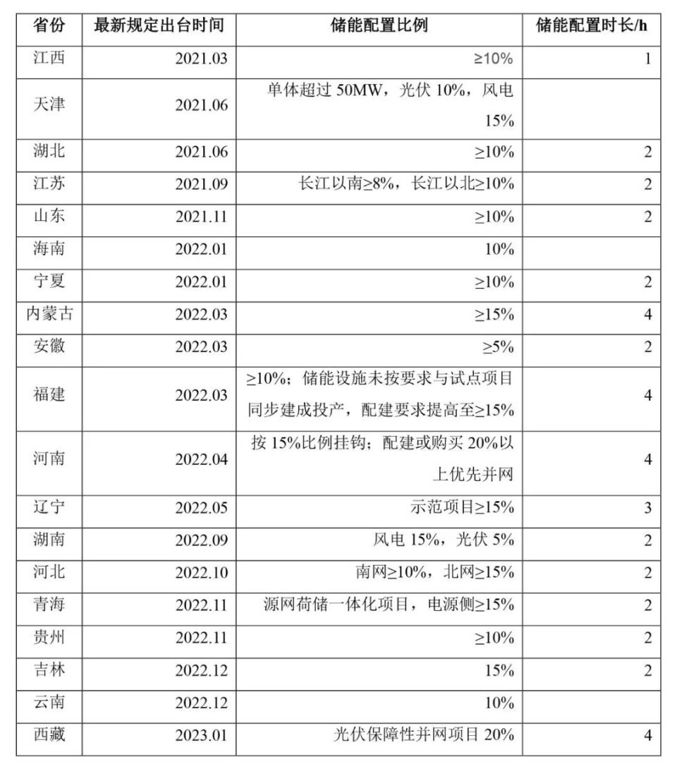 為響應(yīng)上述國家政策的號召,在地方層面,已有多地有關(guān)部門因地制宜地推出了新能源項(xiàng)目(主要為風(fēng)電、光伏電站)的強(qiáng)制配儲政策,部分列示如下: