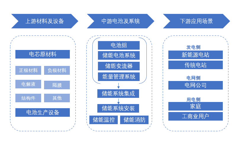 從整個(gè)產(chǎn)業(yè)鏈角度看,儲能產(chǎn)業(yè)鏈上游主要為材料及設(shè)備供應(yīng),中游主要為儲能系統(tǒng)的集成與制造,下游主要為電力系統(tǒng)儲能、備用電源及其他領(lǐng)域等。
