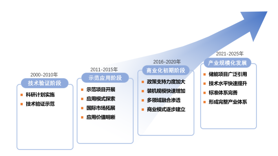 我國儲能市場大致可分為四個(gè)發(fā)展階段:一是技術(shù)驗(yàn)證階段(2010年以前),主要是開展基礎(chǔ)研發(fā)和技術(shù)驗(yàn)證示范;二是示范應(yīng)用階段(2011~2015年),通過示范項(xiàng)目開展,儲能技術(shù)性能快速提升、應(yīng)用模式不斷清晰,應(yīng)用價(jià)值被廣泛認(rèn)可,這個(gè)時(shí)期的儲能裝機(jī)以傳統(tǒng)的抽水蓄能為主;三是商業(yè)化初期(2016~2020年),隨著政策支持力度加大、市場機(jī)制逐漸理順、多領(lǐng)域融合滲透,儲能裝機(jī)規(guī)??焖僭黾?、商業(yè)模式逐漸建立;四是產(chǎn)業(yè)規(guī)模化發(fā)展階段(2021~2025年),儲能產(chǎn)業(yè)進(jìn)入從產(chǎn)業(yè)化初期向規(guī)模化發(fā)展的過渡階段,隨著國家“雙碳”政策提出,儲能規(guī)模獲得了快速增長,儲能項(xiàng)目廣泛應(yīng)用、技術(shù)水平快速提升、標(biāo)準(zhǔn)體系日趨完善,形成較為完整的產(chǎn)業(yè)體系和一批有國際競爭力的市場主體,儲能成為能源領(lǐng)域經(jīng)濟(jì)新增長點(diǎn)。2022年2月,國家發(fā)展改革委、國家能源局印發(fā)的《“十四五”新型儲能發(fā)展實(shí)施方案》(以下簡稱“《實(shí)施方案》”)提出,到2025年,新型儲能由商業(yè)化初期步入規(guī)?;l(fā)展階段,具備大規(guī)模商業(yè)化應(yīng)用條件,有望2030年前后實(shí)現(xiàn)全面市場化。其中,新型儲能是指除抽水蓄能以外的新型儲能技術(shù),包括新型鋰離子電池、液流電池、飛輪、壓縮空氣、氫(氨)儲能、熱(冷)儲能等。