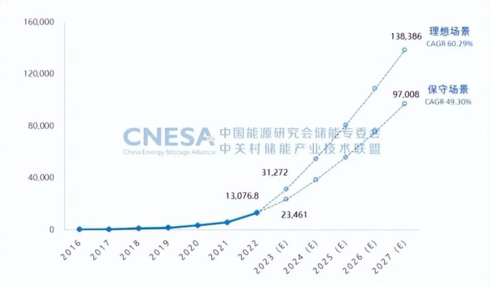 經(jīng)歷“十三五”孕育,“十四五”時(shí)期,我國新型儲能市場有望邁上新臺階。2021開始,我國新型儲能從商業(yè)化初期向規(guī)模化發(fā)展,根據(jù)CNESA預(yù)測,在未來5年,“新能源+儲能”是新型儲能的主要應(yīng)用場景,政策推動將構(gòu)成中國儲能市場的主要增長動力;根據(jù)中國能源研究會儲能專委會/中關(guān)村儲能產(chǎn)業(yè)技術(shù)聯(lián)盟(CNESA)全球儲能數(shù)據(jù)庫的不完全統(tǒng)計(jì),截至2022年底,國內(nèi)已投運(yùn)的電力儲能項(xiàng)目累計(jì)裝機(jī)達(dá)59.8GW,占全球市場總規(guī)模的25%,年增長率38%,其中新型儲能持續(xù)高速發(fā)展,累計(jì)裝機(jī)規(guī)模首次突破10GW,累計(jì)裝機(jī)規(guī)模首次突破10GW,達(dá)到13.1GW/27.1GWh。未來5年,“新能源+儲能”是新型儲能的主要應(yīng)用場景,政策推動是主要增長動力;根據(jù)中關(guān)村儲能產(chǎn)業(yè)技術(shù)聯(lián)盟(CNESA)對我國新型儲能未來5年市場規(guī)模的預(yù)測,保守場景下,預(yù)計(jì)2027年新型儲能累計(jì)規(guī)模將達(dá)到97.0GW,2023-2027年復(fù)合年均增長率(CAGR)為49.3%;理想場景下,預(yù)計(jì)2027年新型儲能累計(jì)規(guī)模將達(dá)到138.4GW,2023-2027年復(fù)合年均增長率(CAGR)為60.3%。預(yù)計(jì)未來5年,年度新增儲能裝機(jī)呈平穩(wěn)上升趨勢。保守場景下,年平均新增儲能裝機(jī)為16.8GW;理想場景下,年平均新增儲能裝機(jī)為25.1GW。