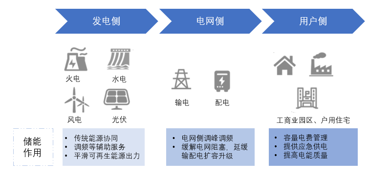 從整個(gè)電力系統(tǒng)的角度看,儲能的應(yīng)用場景可分為發(fā)電側(cè)儲能、電網(wǎng)側(cè)儲能和用戶側(cè)儲能三大場景。其中,發(fā)電側(cè)對儲能的需求場景類型較多,包括可再生能源并網(wǎng)、電力調(diào)峰、系統(tǒng)調(diào)頻等;電網(wǎng)側(cè)儲能主要發(fā)揮支撐電力保供、提升系統(tǒng)調(diào)節(jié)能力、支撐新能源高比例外送以及替代輸配電工程投資等作用;用戶側(cè)儲能主要用于電力自發(fā)自用、峰谷價(jià)差套利、容量電費(fèi)管理和提高供電可靠性等。然而,在實(shí)際應(yīng)用中,儲能的某一功能應(yīng)用并不局限于單一應(yīng)用場景,以平滑輸出、跟蹤出力計(jì)劃為例,可同時(shí)應(yīng)用于發(fā)電側(cè)、電網(wǎng)側(cè)和用戶側(cè)。