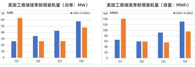 根據(jù)Wood Mackenzie數(shù)據(jù)顯示,2022年美國(guó)新增工商儲(chǔ)裝機(jī)容量為164MW/354MWh,同比+1%/+1%。其中,2022Q4新增48MW/96MWh,同比-17%/-27%,環(huán)比+80%/+71%。