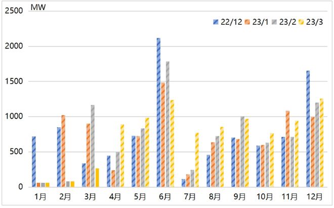 對(duì)比前期(22/12、23/1、23/2)數(shù)據(jù),發(fā)現(xiàn)2023年Q1各月儲(chǔ)能投運(yùn)延期較為顯著,推測(cè)延期原因主要系供應(yīng)鏈問(wèn)題和并網(wǎng)排隊(duì)等。根據(jù)各期數(shù)據(jù),上半年仍有投運(yùn)小高峰,我們分析認(rèn)為這是因?yàn)槊磕?-8月是美國(guó)夏季負(fù)荷高峰,是儲(chǔ)能獲取收益的重要月份,因此6月底前是儲(chǔ)能項(xiàng)目投運(yùn)的重要時(shí)間節(jié)點(diǎn)。