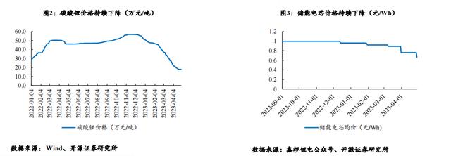 碳酸鋰降價(jià)大背景下,儲(chǔ)能電站經(jīng)濟(jì)性改善有望推動(dòng)電站裝機(jī)持續(xù)放量。受電動(dòng)汽車(chē)需求萎縮影響,碳酸鋰價(jià)格由2022年末 高點(diǎn)的57萬(wàn)元/噸持續(xù)下跌,到2023年4月碳酸鋰價(jià)格最低已跌至17.65萬(wàn)元/噸,相比最高點(diǎn)價(jià)格下滑68.9%。碳酸鋰價(jià)格下同 樣帶動(dòng)儲(chǔ)能電芯售價(jià)持續(xù)下降。截至2023年4月28日,儲(chǔ)能電芯均價(jià)已跌至0.66元/Wh,相比此前的價(jià)格高點(diǎn)已經(jīng)降低了33.7%。 儲(chǔ)能電芯作為鋰電儲(chǔ)能系統(tǒng)當(dāng)中的主要零部件成分,其價(jià)格走低有望進(jìn)一步降低鋰電儲(chǔ)能系統(tǒng)成本提升儲(chǔ)能電站運(yùn)營(yíng)的經(jīng)濟(jì) 性,刺激終端業(yè)主的裝機(jī)需求。成本下行大背景下,全球儲(chǔ)能裝機(jī)有望持續(xù)走高。