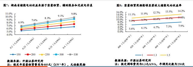并且在容量租賃獎(jiǎng)勵(lì)為1.3倍和1.5倍時(shí),其資本金收益率能夠放大至11.1%與13.5%??紤]到當(dāng)前湖南省仍存在較大的電 網(wǎng)側(cè)儲(chǔ)能裝機(jī)缺口,調(diào)峰服務(wù)輔助頻次和價(jià)格均有望實(shí)現(xiàn)較大的提升,在不考慮容量租賃獎(jiǎng)勵(lì)的情況下,其資本金收益在年調(diào)用次 數(shù)為330次,調(diào)峰輔助服務(wù)收益為0.4元/kWh的情況下,其資本金收益率能夠達(dá)到9.8%。隨著電力輔助服務(wù)種類(lèi)增多和電力現(xiàn)貨市場(chǎng) 的開(kāi)展,其收益方式有望進(jìn)一步增加。同時(shí)儲(chǔ)能電站的收益在一定程度上依賴電站運(yùn)營(yíng)商自身的運(yùn)營(yíng)水平,隨著儲(chǔ)能電站運(yùn)營(yíng)商的 經(jīng)驗(yàn)積累,收益能力有望進(jìn)一步提升。