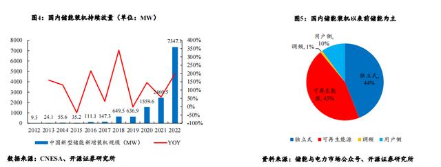 國(guó)內(nèi)儲(chǔ)能裝機(jī)有望持續(xù)增長(zhǎng),表前儲(chǔ)能為裝機(jī)主力。根據(jù)CNESA數(shù)據(jù)統(tǒng)計(jì),2012-2022年間國(guó)內(nèi)新型儲(chǔ)能新增裝機(jī)復(fù)合增 速高達(dá)95%。2022年國(guó)內(nèi)新型儲(chǔ)能新增裝機(jī)高達(dá)7.3GW,同比增長(zhǎng)近200%。就國(guó)內(nèi)儲(chǔ)能裝機(jī)類(lèi)型分布而言,根據(jù)儲(chǔ)能與 電力市場(chǎng)公眾號(hào)統(tǒng)計(jì),可再生能源配儲(chǔ)與獨(dú)立儲(chǔ)能裝機(jī)占比分別為45%與44%,用于調(diào)頻的裝機(jī)占比僅為1%,工商業(yè)用 戶側(cè)儲(chǔ)能裝機(jī)占比10%。我國(guó)當(dāng)前的儲(chǔ)能類(lèi)型主要還是以用于配套新能源裝機(jī)的表前儲(chǔ)能裝機(jī)為主。