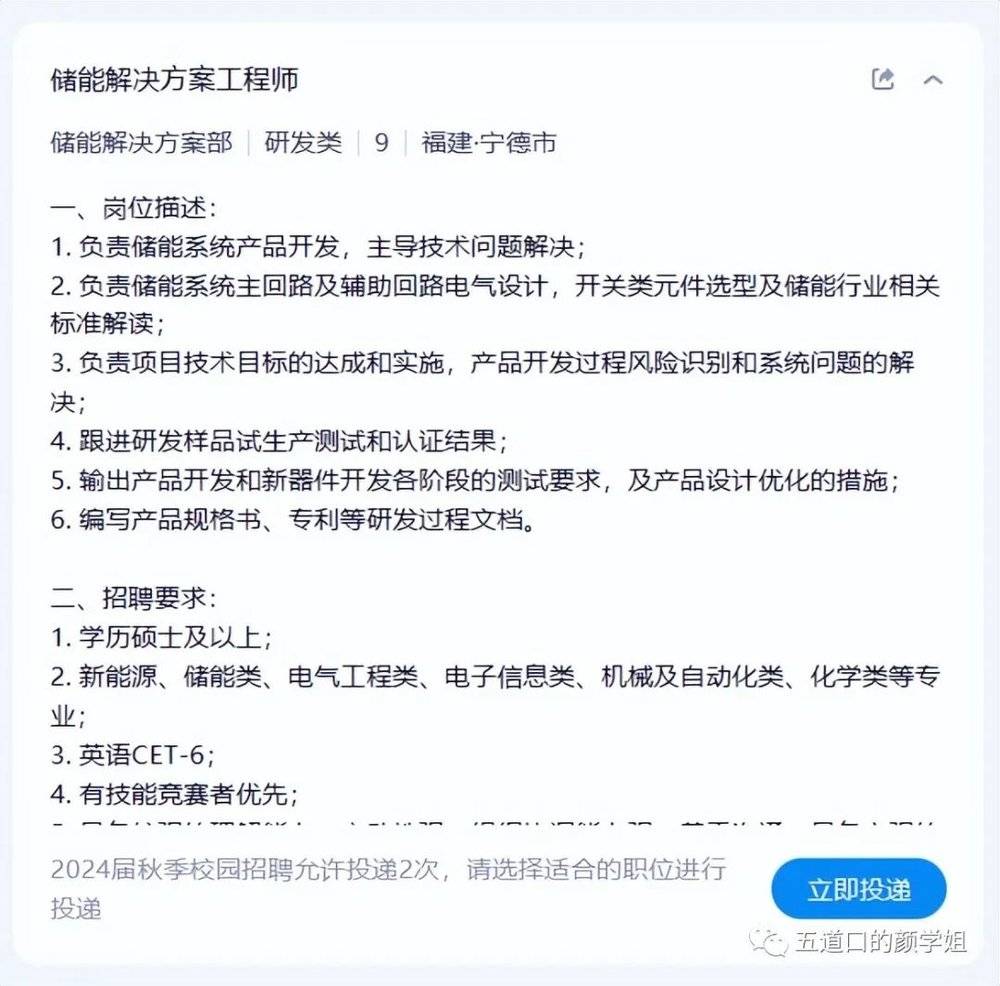 寧德時代的儲能方案工程師的招聘要求是:新能源、儲能類、電氣工程類、機(jī)械類、電子信息類、化學(xué)類。