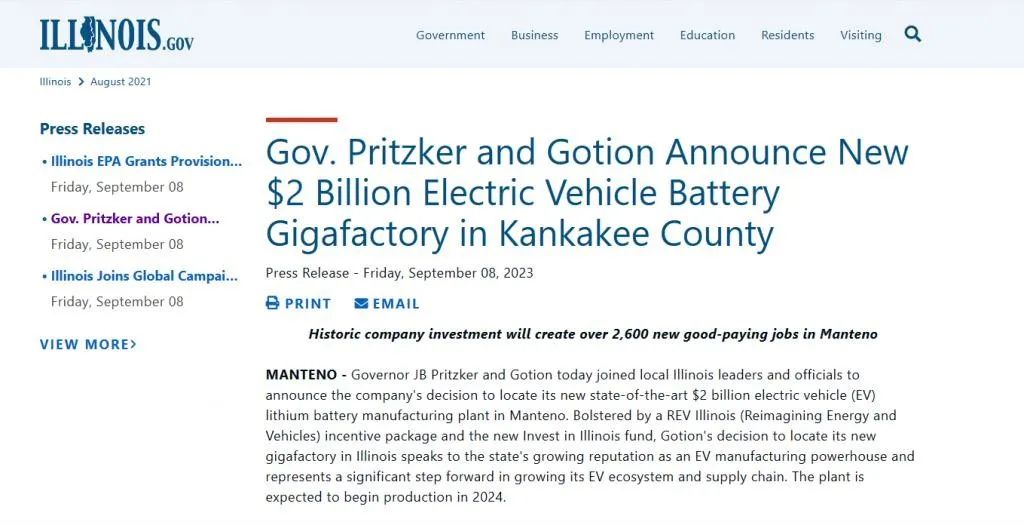 本月初,美國(guó)伊利諾伊州政府官網(wǎng)曾發(fā)布消息,宣布國(guó)軒高科將斥資20億美元(約147億元人民幣)在該州坎卡基縣曼特諾新建電動(dòng)汽車(chē)電池超級(jí)工廠。