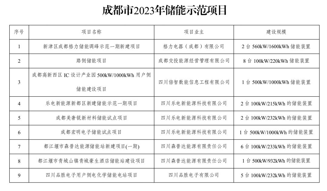 為加快推動(dòng)成都市儲(chǔ)能產(chǎn)業(yè)發(fā)展,著力構(gòu)建清潔低碳安全高效的現(xiàn)代能源體系,前期成都市發(fā)改委印發(fā)了《關(guān)于申報(bào)2023年污染治理和節(jié)能減碳領(lǐng)域(儲(chǔ)能專(zhuān)項(xiàng))市預(yù)算內(nèi)投資項(xiàng)目的通知》(成發(fā)改環(huán)資函〔2023〕92號(hào)),對(duì)年利用小時(shí)數(shù)不低于600小時(shí)的儲(chǔ)能示范設(shè)施給予每千瓦230元/年補(bǔ)助,補(bǔ)貼周期為連續(xù)3年,每年最高不超過(guò)100萬(wàn)。經(jīng)企業(yè)自愿申報(bào)和專(zhuān)家評(píng)審,共有9個(gè)儲(chǔ)能項(xiàng)目被納入成都市2023年儲(chǔ)能示范項(xiàng)目,現(xiàn)予以公示。