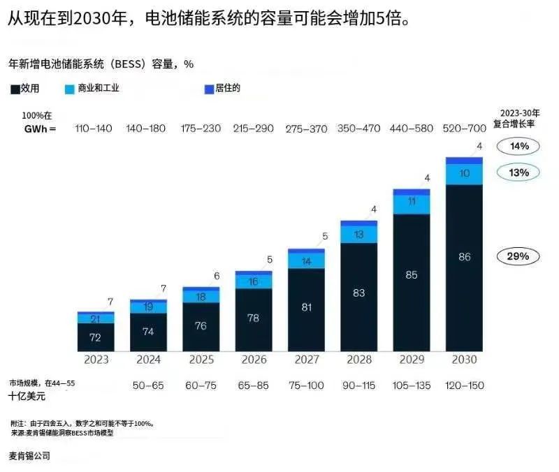 我們預(yù)計,公用事業(yè)規(guī)模的電化學(xué)儲能(已占新增年產(chǎn)能的大部分)將在未來六年中每年都增長29%左右,是三個細分市場中增長最快的。預(yù)計到2030年,公用事業(yè)規(guī)模的年度裝機容量將達到450至620吉瓦時(GWh),公用事業(yè)規(guī)模的電化學(xué)儲能將占據(jù)當年總市場的90%。
