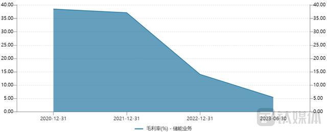 而細(xì)看公司儲(chǔ)能業(yè)務(wù)的毛利率,可以得知自2020年開(kāi)始,該業(yè)務(wù)毛利率逐年下滑,其中2022年的下降幅度最為明顯。相關(guān)數(shù)據(jù)顯示,2020年—2022年及2023年上半年,儲(chǔ)能業(yè)務(wù)的毛利率分別為38.53%、37.17%、14.05%及5.41%。