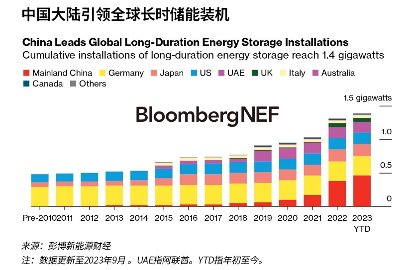 LDES部署在2022年加速,主要受到中國(guó)的推動(dòng)。然而,部署規(guī)模仍然很小。截至2023年9月,我們追蹤到全球已投運(yùn)LDES裝機(jī)容量約為1.4GW/8.2GWh,不到鋰離子電池裝機(jī)量的3%。
