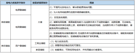 目前,儲(chǔ)能技術(shù)主要應(yīng)用于電力系統(tǒng)。具體而言,可以將儲(chǔ)能技術(shù)在電力系統(tǒng)中的典型應(yīng)用場(chǎng)景劃分為電源側(cè)、電網(wǎng)側(cè)和用戶側(cè)三個(gè)方面。其中電源側(cè)、電網(wǎng)側(cè)儲(chǔ)能又稱(chēng)為表前儲(chǔ)能或大儲(chǔ),用戶側(cè)儲(chǔ)能又稱(chēng)為表后儲(chǔ)能。用戶側(cè)儲(chǔ)能分為工商業(yè)儲(chǔ)能與戶儲(chǔ),兩者區(qū)別在于客戶群體。