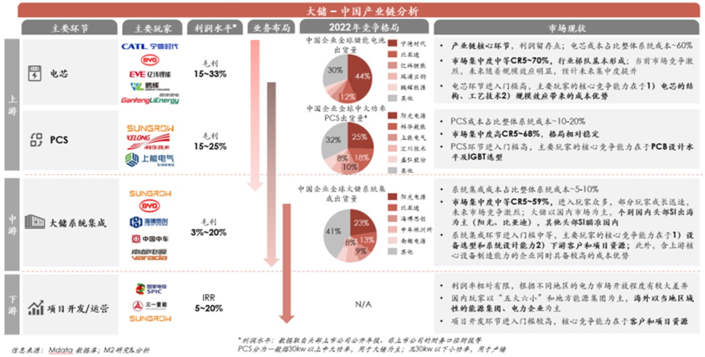 覓途咨詢的調(diào)研顯示,在大儲(chǔ)系統(tǒng)的價(jià)值鏈中,上游設(shè)備制造環(huán)節(jié)是核心的利潤留存點(diǎn),技術(shù)壁壘高,新玩家難以進(jìn)入市場(chǎng);中游系統(tǒng)集成環(huán)節(jié)玩家眾多,市場(chǎng)競(jìng)爭(zhēng)激烈,核心競(jìng)爭(zhēng)點(diǎn)在客戶和項(xiàng)目資源開發(fā)能力,僅有個(gè)別頭部玩家以出海業(yè)務(wù)為主;未來伴隨運(yùn)營市場(chǎng)成熟IRR提升,更多企業(yè)將向下滲透。