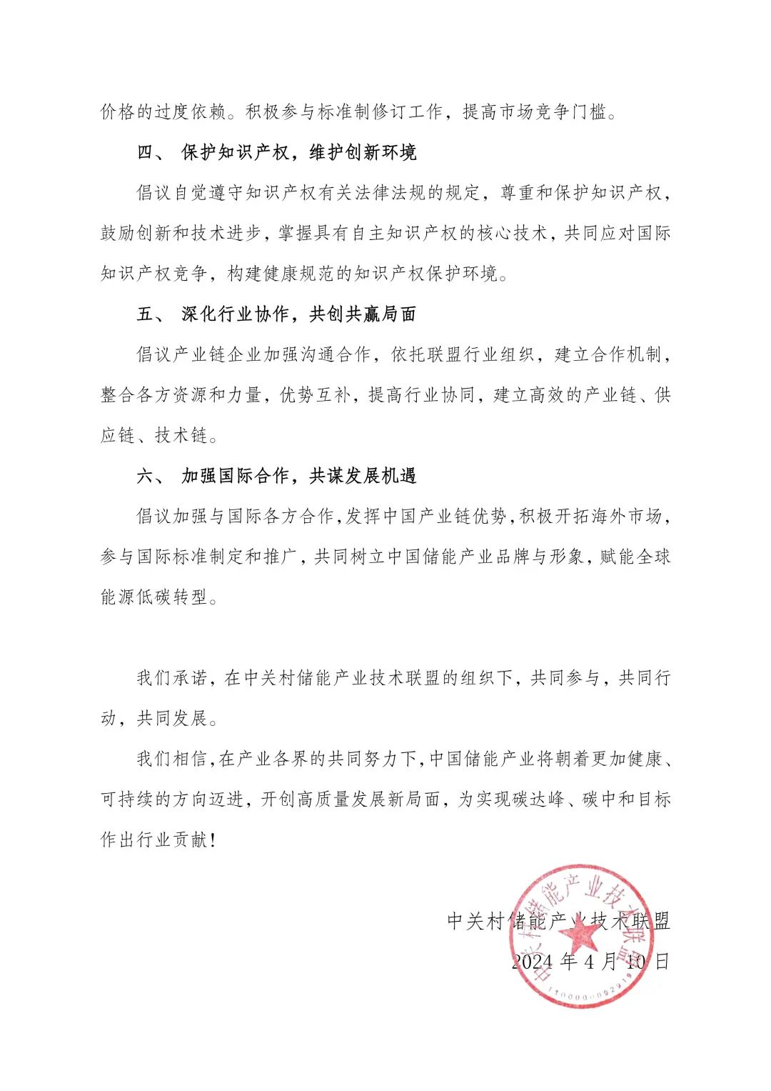 倡議加入《儲(chǔ)能產(chǎn)業(yè)自律公約》,共同打造健康的產(chǎn)業(yè)生態(tài)和良性的輿論氛圍,積極探索和嘗試新的商業(yè)模式,激發(fā)產(chǎn)業(yè)活力,提高儲(chǔ)能產(chǎn)業(yè)的盈利能力和市場(chǎng)競(jìng)爭(zhēng)力,為行業(yè)發(fā)展創(chuàng)造更加有利的市場(chǎng)環(huán)境。