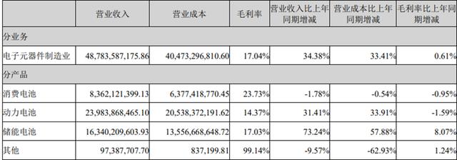 由于多數(shù)訂單為長(zhǎng)期合同,儲(chǔ)能電池業(yè)務(wù)受價(jià)格戰(zhàn)影響較小,營(yíng)業(yè)收入達(dá)到163.4億元,同比增長(zhǎng)73.24%,占總營(yíng)收的33.5%,毛利率也提升了8.07個(gè)百分點(diǎn)至17.03%。