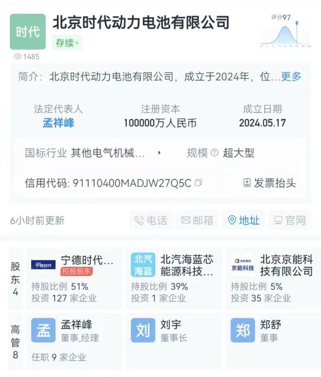 《中國(guó)經(jīng)營(yíng)報(bào)》記者在天眼查上看到,5月17日,北京時(shí)代動(dòng)力電池有限公司成立,法定代表人為孟祥峰,注冊(cè)資本10億元人民幣,是一家以從事電氣機(jī)械和器材制造業(yè)為主的企業(yè)。股東信息顯示,該公司由寧德時(shí)代、小米汽車科技有限公司、北汽海藍(lán)芯能源科技(北京)有限公司、北京京能科技有限公司共同持股。