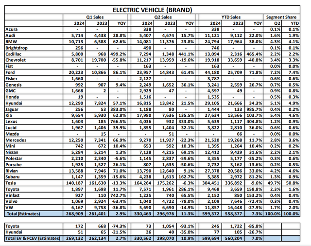 然而,由于競(jìng)爭(zhēng)的影響,特斯拉第二季度的美國(guó)電動(dòng)汽車(chē)市場(chǎng)份額首次跌破50%的門(mén)檻,降至49.7%。盡管特斯拉銷(xiāo)量下滑,但縱觀第二季度全美純電市場(chǎng),整體同比增長(zhǎng)了11.3%,雖然與上年同期相比,增速放緩,但上升趨勢(shì)也說(shuō)明美國(guó)消費(fèi)市場(chǎng)對(duì)電動(dòng)汽車(chē)仍有一定的需求。