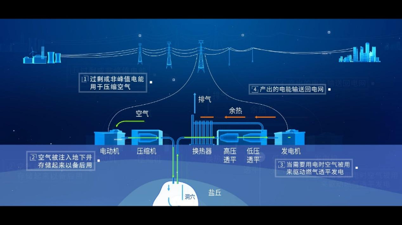 儲(chǔ)能時(shí),利用過(guò)?;蚍欠逯惦娔茯?qū)動(dòng)電動(dòng)機(jī)旋轉(zhuǎn),將電能轉(zhuǎn)化為機(jī)械能,電動(dòng)機(jī)帶動(dòng)壓縮機(jī)(一種將低壓氣體提升為高壓氣體的機(jī)械)將空氣從低壓狀態(tài)壓縮至高壓狀態(tài),并將高壓空氣儲(chǔ)存在儲(chǔ)氣裝置(鹽穴、人工硐室或儲(chǔ)氣罐)中,最終將電能轉(zhuǎn)換成空氣熱能和壓力能。