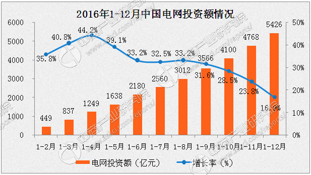 從電網(wǎng)投資來看,2016年1-12月,全國(guó)電網(wǎng)投資額達(dá)到5426億元,同比增長(zhǎng)16.9%。從月度增長(zhǎng)趨勢(shì)可見,全國(guó)電網(wǎng)投資的增速逐漸放緩。