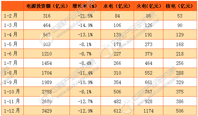 從電源投資來看,2016年1-12月,全國(guó)電源投資額達(dá)到3429億元,同比下降12.9%。其中,水電投資額為612億元,同比下降22.4%;火電投資額達(dá)到1174億元,同比增加0.9%;核電投資額為506億元,同比下降10.5%。