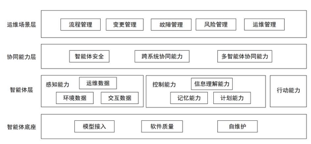 該架構(gòu)以?場景需求為牽引??,通過協(xié)同層打通系統(tǒng)壁壘,以智能體層的感知-決策-行動閉環(huán)為核心能力載體,最終由底座提供工程化支撐。四層能力環(huán)環(huán)相扣,既明確了技術(shù)能力邊界,又強(qiáng)調(diào)實(shí)際落地場景的適配性,為企業(yè)構(gòu)建智能運(yùn)維體系提供清晰的模塊化建設(shè)路徑。