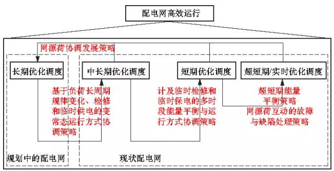 根據(jù)上述分析,本文提出了在時(shí)間尺度上形成“長期—中長期—短期—超短期/實(shí)時(shí)”的多時(shí)間尺度遞進(jìn)式優(yōu)化調(diào)度策略,并以“局部平衡—分區(qū)協(xié)調(diào)—整體吸納”為原則,協(xié)調(diào)分布式電源、微電網(wǎng)、儲(chǔ)能裝置、可控負(fù)荷等調(diào)度對(duì)象,從而達(dá)到提高配電網(wǎng)供電可靠性與經(jīng)濟(jì)性,實(shí)現(xiàn)智能配電系統(tǒng)高效運(yùn)行的目標(biāo)。優(yōu)化調(diào)度模式層次結(jié)構(gòu)如圖2所示。