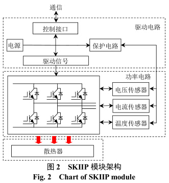 賽米控智能集成功率(Semikron integrated intel-ligent power,SKIIP)模塊[6]集成了功率半導(dǎo)體器件、散熱器以及具有保護(hù)和監(jiān)測(cè)電路的門極驅(qū)動(dòng)電路,并具有用于短路和過(guò)電流保護(hù)的閉環(huán)電流傳感器,同時(shí)還集成了溫度傳感器。采用SKIIP模塊[6]可以大大簡(jiǎn)化逆變器主電路,提高系統(tǒng)的抗干擾能力,該模塊具有標(biāo)準(zhǔn)接口,其架構(gòu)如圖2所示。