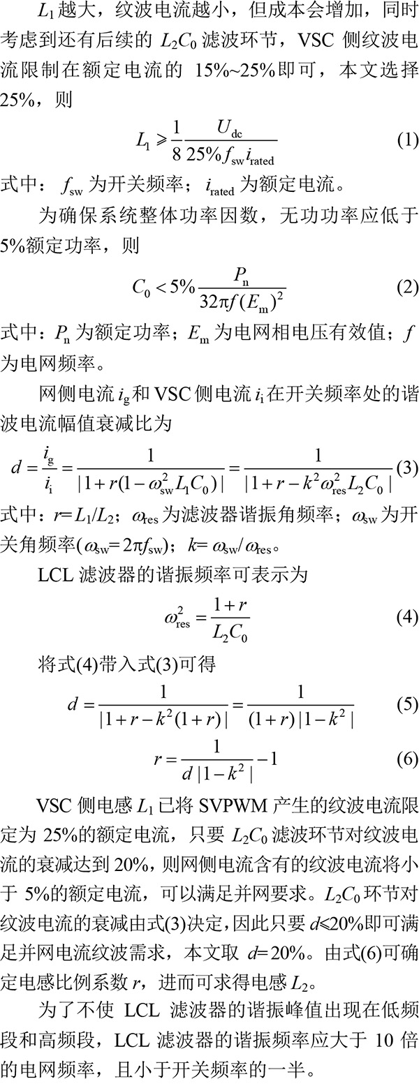 相對(duì)于傳統(tǒng)的單電感濾波器,3階LCL濾波器能更好地抑制并網(wǎng)變換器引起的電流諧波。LCL濾波器的參數(shù)對(duì)系統(tǒng)的動(dòng)態(tài)及穩(wěn)態(tài)性能影響很大,文獻(xiàn)[7]對(duì)LCL濾波器參數(shù)的限制條件以及設(shè)計(jì)步驟做了詳細(xì)介紹,本文在此基礎(chǔ)上確定LCL濾波器的參數(shù)。根據(jù)VSC側(cè)電流最大允許紋波得到VSC側(cè)電感L1的最小值,根據(jù)系統(tǒng)的無(wú)功功率限定值求得濾波電容C0,最后根據(jù)并網(wǎng)電流總諧波得到網(wǎng)側(cè)電感L2。