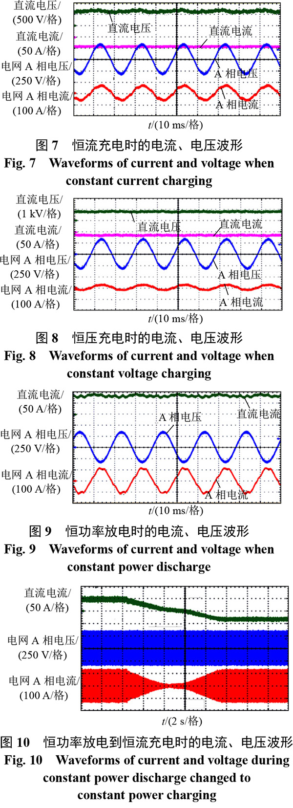 利用本文儲(chǔ)能并網(wǎng)變換器實(shí)現(xiàn)方案研制了試驗(yàn)樣機(jī),并進(jìn)行了鋰電池儲(chǔ)能系統(tǒng)充放電測(cè)試,具體試驗(yàn)內(nèi)容為恒流充電、恒壓充電、恒功率放電以及由充電到放電的過(guò)渡。