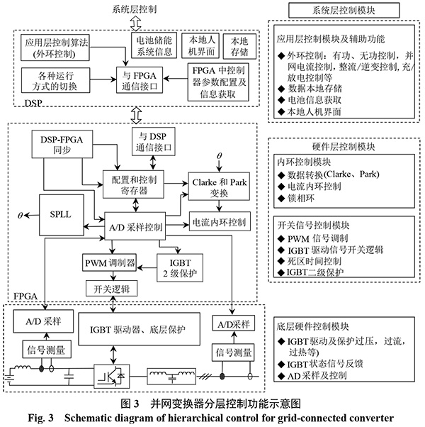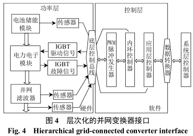 參照通信系統(tǒng)的開(kāi)放系統(tǒng)互連(open system in-terconnection,OSI)模型,并網(wǎng)變換器分層控制功能示意圖如圖3所示。圖3中:θ為電網(wǎng)電壓相位;SPLL(software phase loop)為軟鎖相環(huán)[11];IGBT(insulated gate bipolar transistor)為絕緣柵雙極型晶體管。硬件層控制模塊由FPGA完成;應(yīng)用層控制模塊由DSP完成算法運(yùn)算,提高了系統(tǒng)靈活性;系統(tǒng)層控制由上位機(jī)完成,可以實(shí)現(xiàn)多個(gè)儲(chǔ)能系統(tǒng)的大規(guī)模調(diào)度。層次化的并網(wǎng)變換器接口如圖4所示。