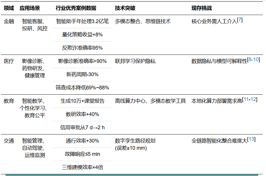 當前,AI大模型已在金融、醫(yī)療、教育、交通等領(lǐng)域?qū)崿F(xiàn)深度滲透,展現(xiàn)出顯著的產(chǎn)業(yè)價值與技術(shù)潛力。如表1所示,在金融領(lǐng)域,智能客服與風(fēng)控系統(tǒng)的高效運作體現(xiàn)了多模態(tài)整合與思維鏈技術(shù)的成熟應(yīng)用,但核心決策仍依賴人工。醫(yī)療領(lǐng)域通過聯(lián)邦學(xué)習(xí)等技術(shù)突破,在影像診斷、藥物研發(fā)等方面取得成果,但數(shù)據(jù)隱私與模型可解釋性仍是關(guān)鍵瓶頸。教育領(lǐng)域依托離線算力中心與多模態(tài)工具,實現(xiàn)教學(xué)效率躍升,而本地化算力需求成為規(guī)模化應(yīng)用的制約因素。交通領(lǐng)域借助數(shù)字孿生技術(shù)顯著提升運維效率,但全鏈路智能化整合仍需突破。