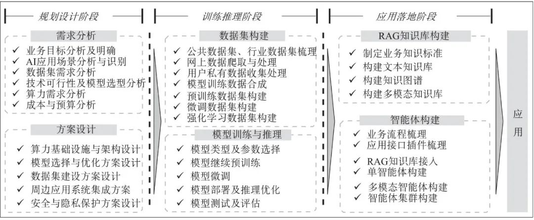 AI工程化整體流程涵蓋規(guī)劃設(shè)計、訓(xùn)練推理和應(yīng)用落地三個階段(如圖1所示)。在規(guī)劃設(shè)計階段,首要關(guān)注企業(yè)戰(zhàn)略和業(yè)務(wù)目標選擇,圍繞全鏈路規(guī)劃展開需求分析,包括業(yè)務(wù)目標分析、AI應(yīng)用場景分析、數(shù)據(jù)需求分析、技術(shù)可行性及算力需求分析等。同時,基于AI原生(AI Native)的系統(tǒng)方案設(shè)計強調(diào)業(yè)務(wù)需求理解、數(shù)據(jù)治理、模型優(yōu)化與部署以及監(jiān)控與運維的重要性,遵循以AI為核心、數(shù)據(jù)優(yōu)先、持續(xù)學(xué)習(xí)與迭代、自適應(yīng)與個性化等設(shè)計原則。在訓(xùn)練推理階段,針對通用AI大模型存在的“有幻覺、成本高”等問題,行業(yè)、領(lǐng)域AI大模型成為落地“人工智能+”的有效手段,企業(yè)需根據(jù)自身情況選擇開發(fā)L1行業(yè)模型或L2場景模型,并依托成熟工具平臺支撐數(shù)據(jù)集工程交付能力,同時注重模型體系設(shè)計與選擇、訓(xùn)練及調(diào)優(yōu)以及推理優(yōu)化及評估等關(guān)鍵環(huán)節(jié)。在應(yīng)用落地階段,智能體應(yīng)用為AI大模型應(yīng)用落地提供技術(shù)化手段,通過構(gòu)建檢索增強生成(Retrieval-Augmented Generation,RAG)知識庫解決私域數(shù)據(jù)利用及實時性問題,同時智能體構(gòu)建的技術(shù)方法手段多樣,包括通過開發(fā)框架直接開發(fā)和基于智能體使能平臺構(gòu)建應(yīng)用,且智能體全生命周期可觀測體系和集群全生命周期管理體系為企業(yè)AI應(yīng)用的穩(wěn)定運行和持續(xù)優(yōu)化提供保障。
