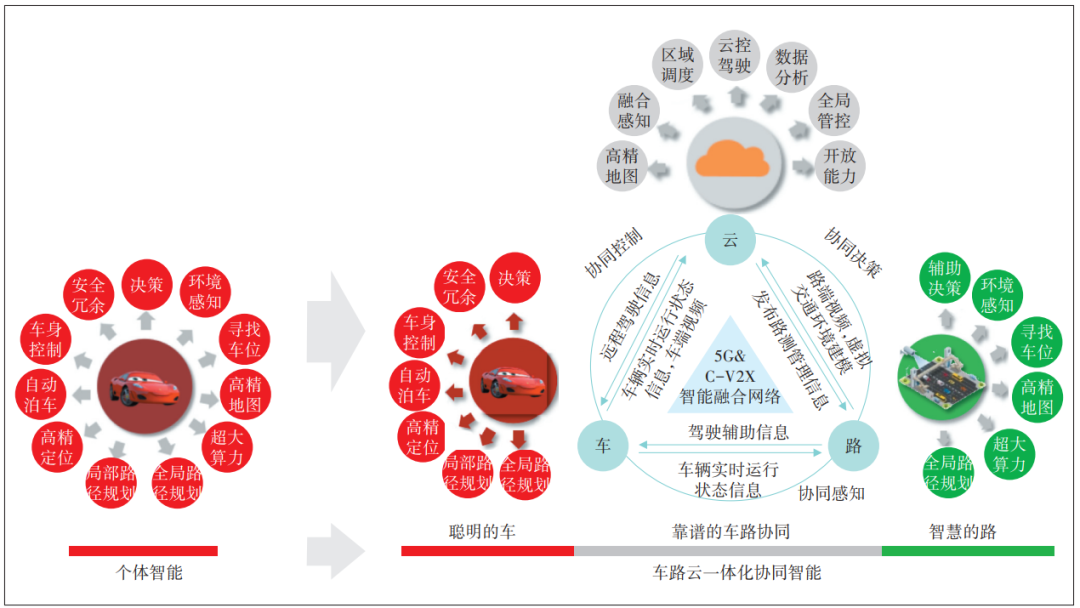 隨著車輛智能化水平的不斷提高,車載計算設(shè)備的算力逐漸難以滿足復(fù)雜路況下實時處理大量數(shù)據(jù)的需求,既是成本瓶頸,也是能力瓶頸。為解決這一問題,行業(yè)研究出車路云一體化的技術(shù)演進路線(見圖5)。此方案體系下,車輛通過高速穩(wěn)定的通信網(wǎng)絡(luò)與云端服務(wù)器、道路感知設(shè)備進行實時數(shù)據(jù)交互。云端強大的計算能力既可對車輛上傳的大量傳感器數(shù)據(jù)進行快速處理和分析,也可處理道路感知設(shè)備上報的實時道路信息和交通狀況。平臺綜合分析后將決策指令及時反饋給車輛,從而輔助車輛做出更精準(zhǔn)的決策。車路云一體化的技術(shù)方案可有效彌補車輛自身算力不足,進一步提升智能網(wǎng)聯(lián)車輛的運行效率和安全性,并為降低智能駕駛成本推動智能網(wǎng)聯(lián)汽車快速普及,助力智能交通發(fā)展提供堅實基礎(chǔ)。