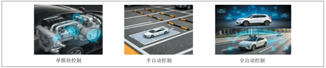 智能網(wǎng)聯(lián)汽車的技術(shù)演進歷程一般分為3個階段(見圖4)。第1階段是單模塊控制階段,車輛各個關(guān)鍵部件如動力系統(tǒng)、制動系統(tǒng)等都各自配備獨立的控制模塊,模塊之間協(xié)同性較差,只能實現(xiàn)基礎(chǔ)、相對簡單的功能,例如簡單的定速巡航,車輛無法自主應(yīng)對復(fù)雜路況;第2階段是半自動控制階段,部分駕駛?cè)蝿?wù)可以由車輛自動完成,例如記憶泊車功能,車輛能夠自動識別停車位并精準(zhǔn)控制轉(zhuǎn)向、速度等完成泊車動作,但仍需要駕駛員參與;第3階段是全自動控制階段,車輛已達成真正意義上的高度智能化與自主化。車輛依托自身及周邊環(huán)境多傳感器融合技術(shù)構(gòu)建起全方位、高精度的環(huán)境感知體系,并基于云端智能網(wǎng)聯(lián)平臺的強大賦能,具備強大的駕駛決策能力,可實時調(diào)整行駛策略以應(yīng)對復(fù)雜多變交通場景,全程無需駕駛員任何干預(yù)。