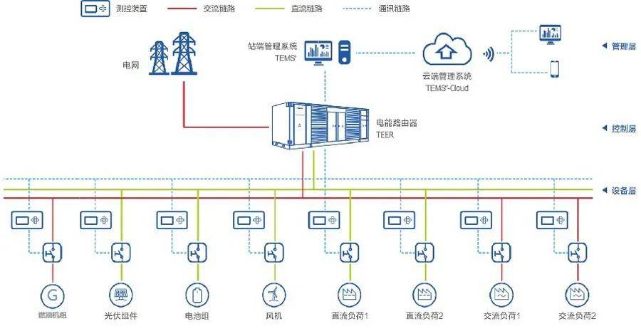 基于電力電子變壓器的交直流混合微網(wǎng)系統(tǒng)總體可分為三層架構。第一層為設備層,主要囊括了分布式電源(風電、光伏系統(tǒng)等)和不同的交直流負荷;第二層控制層,以電力電子變壓器為核心,分布式電源和負荷可通過其靈活的多端口配置實現(xiàn)可靠接入,并通過其中/高壓接口,實現(xiàn)與配電網(wǎng)的有效連接;第三層為管理層,以“雙端”能量管理系統(tǒng)為核心,采用人工智能算法可實現(xiàn)電力電子變壓器交直流混合系統(tǒng)的分布式能源互補優(yōu)化以及多個端口之間的協(xié)調控制,提高能源利用效率,多機并聯(lián)系統(tǒng)的集群控制、功率在線優(yōu)化分配,保障系統(tǒng)效率最優(yōu),同時能夠對接電網(wǎng)調度,參與電力市場交易及輔助服務等,真正實現(xiàn)綠色數(shù)據(jù)中心電能的智能路由。