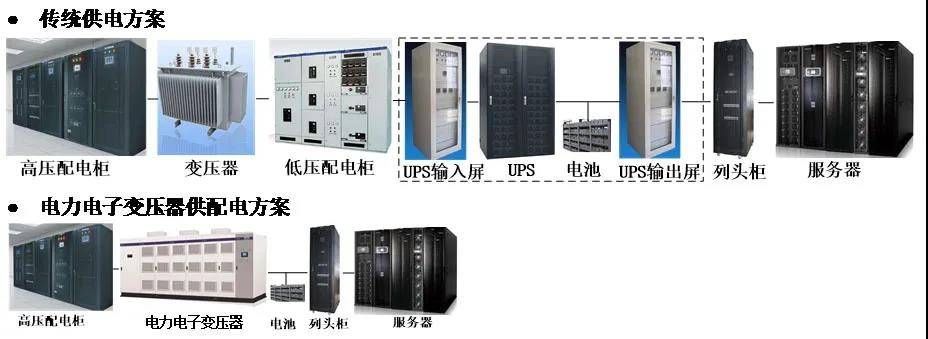 數(shù)據(jù)中心傳統(tǒng)的UPS供電方案,是由高壓配電柜、變壓器、低壓配電柜、UPS等組成,雖然系統(tǒng)方案成熟,但由于設備種類數(shù)量多,電能變換環(huán)節(jié)多,占地面積大,轉換效率低,已有被逐步淘汰的趨勢。