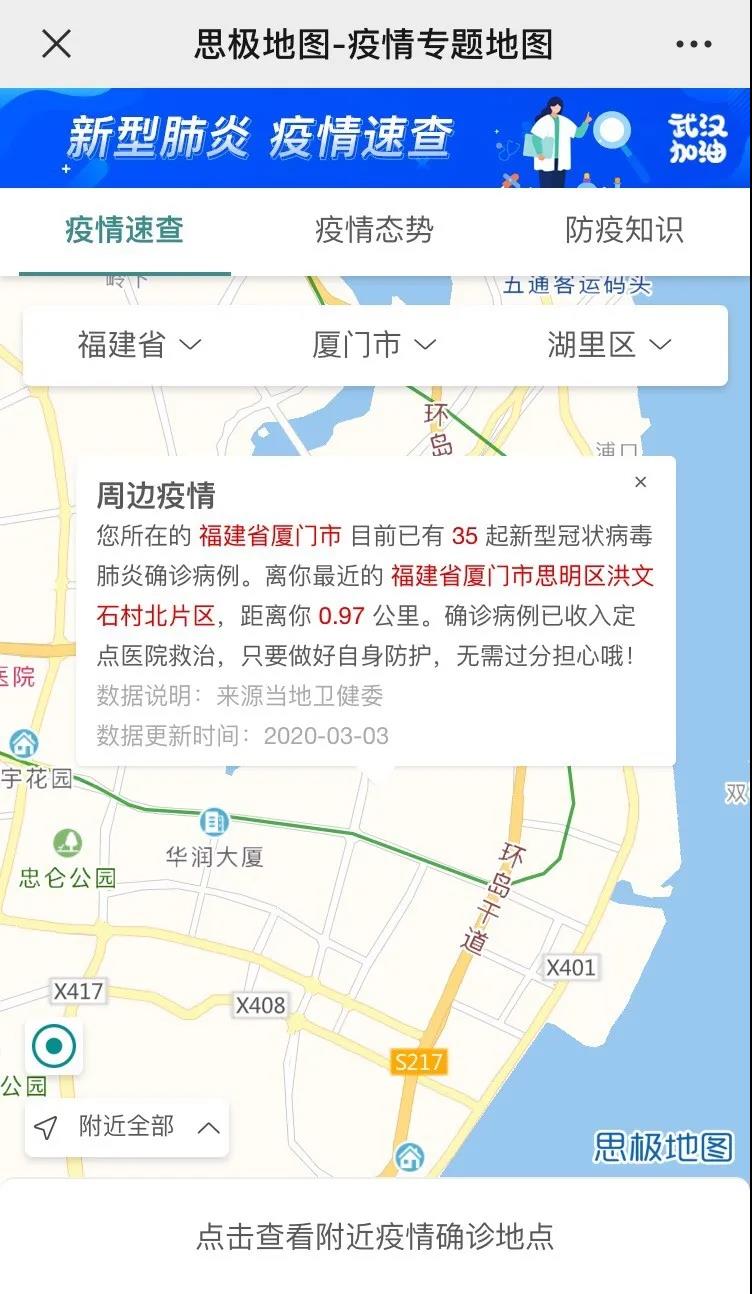 疫情專題地圖可為廣大用戶提供在線的疫情速查、展示疫情時空演進(jìn)變化、分享科學(xué)有效的防疫知識,幫助用戶定位周邊的確診病例,掌握疫情的最新動態(tài),緩解大眾焦慮,支持防疫工作有效開展,筑起一道安全防護墻。