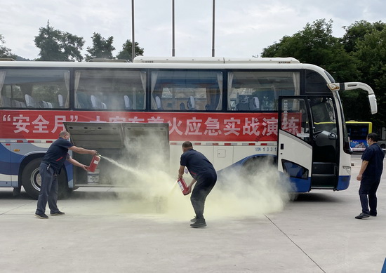 在演練時(shí),隨著滿(mǎn)載乘客的大客車(chē)行駛至劉電賓館門(mén)前,突然行李艙起火,大客車(chē)駕駛員在突然遇火險(xiǎn)緊急情況下,立即開(kāi)啟應(yīng)急雙閃燈,靠邊停車(chē),打開(kāi)車(chē)門(mén),迅速引導(dǎo)車(chē)內(nèi)乘客有序疏散,并要求大家用濕毛巾捂住口鼻,彎腰依次撤離到車(chē)外安全地帶。緊接著滅火組演練人員迅速行動(dòng)起來(lái),熟練地取出車(chē)載滅火器,拔下滅火器安全銷(xiāo),用噴口對(duì)準(zhǔn)火源根部,及時(shí)將火撲滅,救護(hù)組及時(shí)疏散和救援下車(chē)人員,并對(duì)傷員身體狀況進(jìn)行基本護(hù)理和檢查。整個(gè)演練過(guò)程既緊張,又有條不紊,進(jìn)一步增強(qiáng)了全體員工的安全意識(shí),真正掌握了交通工具突發(fā)火險(xiǎn)后迅速逃生、自救、互救的基本方法,達(dá)到了演練的預(yù)期目的。