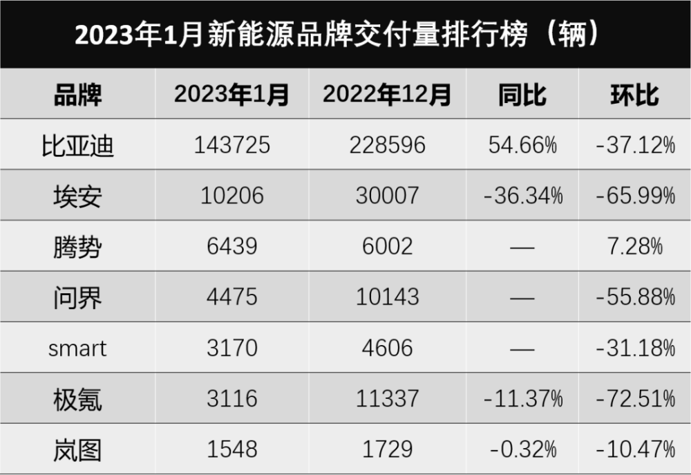 2023年的第一個(gè)月份,各家新能源車企也是準(zhǔn)時(shí)公布了銷量成績,說實(shí)話,基本都不怎么好看,受春節(jié)假期的影響,大部分車型都出現(xiàn)了“腰斬”的現(xiàn)象。