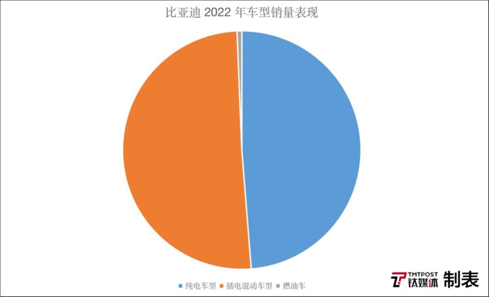 數(shù)據(jù)顯示,比亞迪 2022 年全年累計銷量達到了 186.9 萬輛,其中來自純電車型和插電混動車型銷量分別為 91.1 萬輛、94.6 萬輛,燃油車銷量僅有 1.2 萬輛。